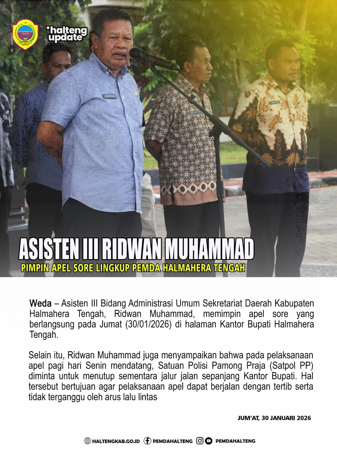 Weda, 30 Januari 2026 – Asisten III Bidang Administrasi Umum Sekretariat Daerah Kabupaten Halmahera Tengah, Ridwan Muhammad, memimpin apel sore yang berlangsung pada Jumat (30/01/2026) di halaman Kantor Bupati Halmahera Tengah.