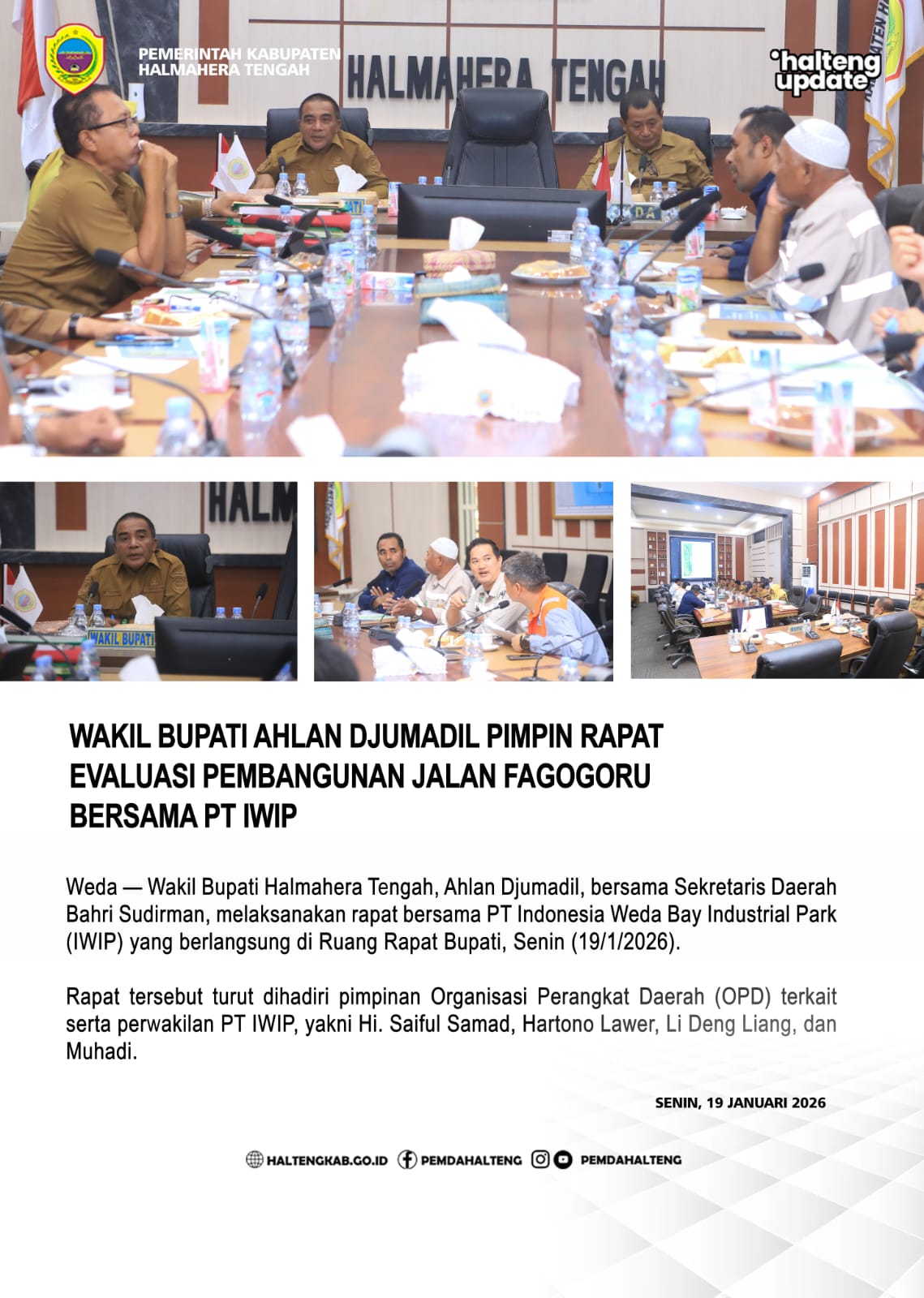 Weda — Wakil Bupati Halmahera Tengah, Ahlan Djumadil, bersama Sekretaris Daerah Bahri Sudirman, melaksanakan rapat bersama PT Indonesia Weda Bay Industrial Park (IWIP) yang berlangsung di Ruang Rapat Bupati, Senin (19/1/2026). Rapat tersebut turut dihadiri pimpinan Organisasi Perangkat Daerah