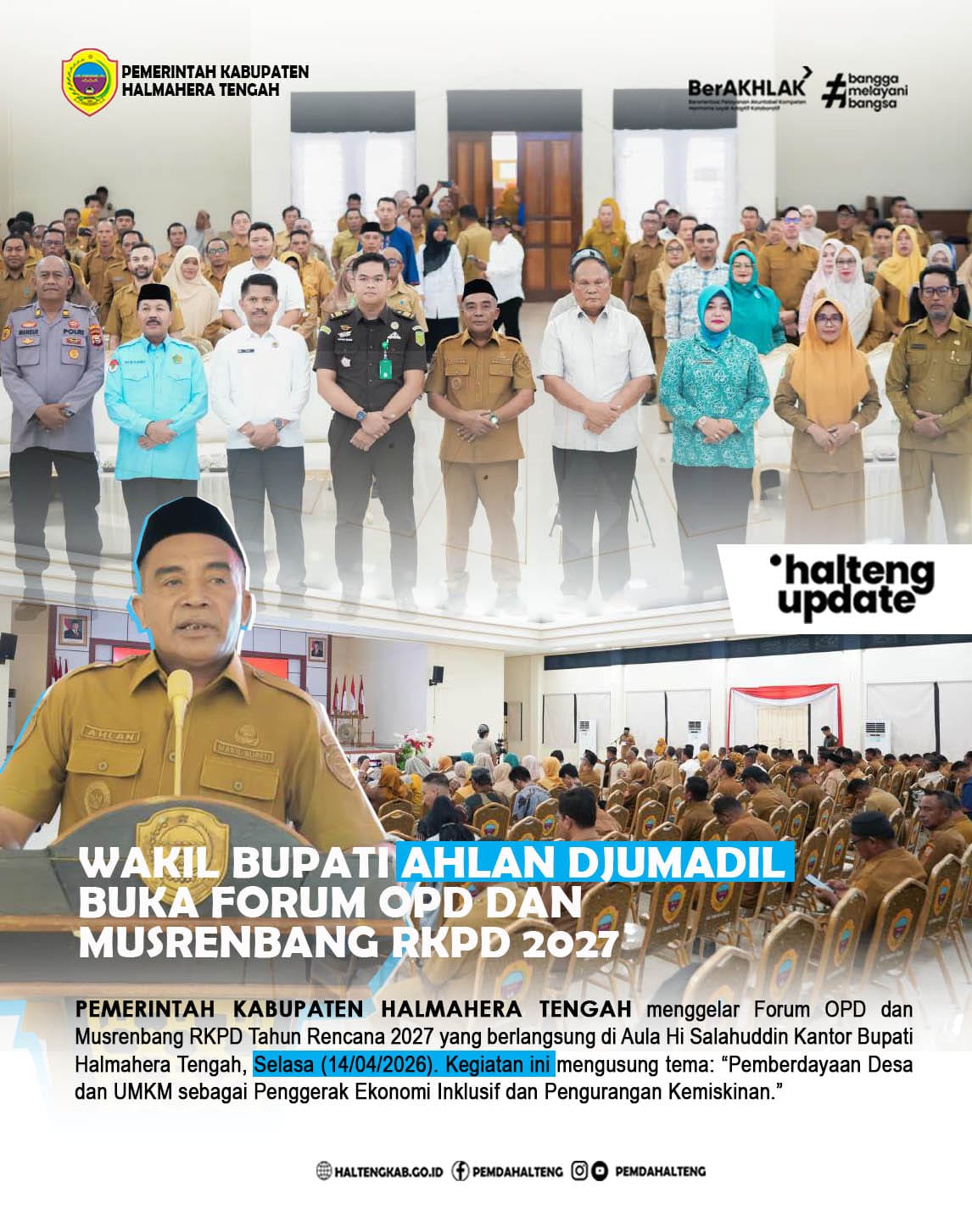 Pemerintah Kabupaten Halmahera Tengah menggelar Forum OPD dan Musrenbang RKPD Tahun Rencana 2027 yang berlangsung di Aula Hi Salahuddin Kantor Bupati Halmahera Tengah, Selasa (14/04/2026). Kegiatan ini mengusung tema: “Pemberdayaan Desa dan UMKM sebagai Penggerak Ekonomi Inklusif dan Pengurangan Kemiskinan.”