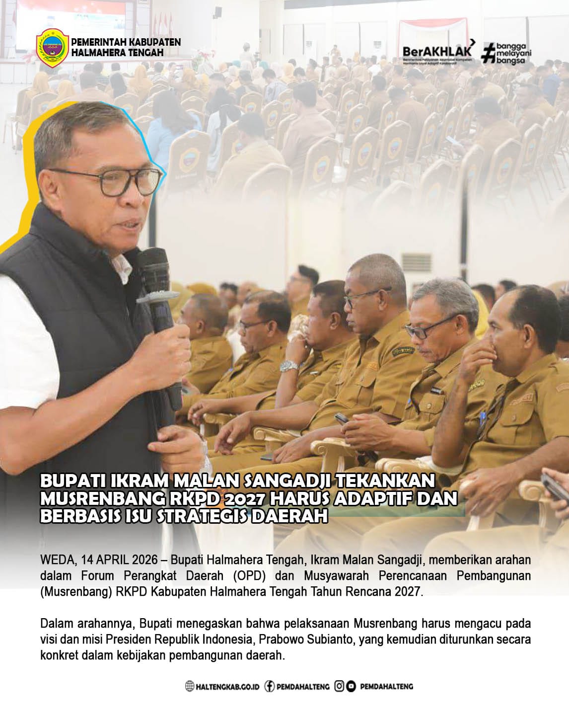 WEDA, 14 APRIL 2026 – Bupati Halmahera Tengah, Ikram Malan Sangadji, memberikan arahan dalam Forum Perangkat Daerah (OPD) dan Musyawarah Perencanaan Pembangunan (Musrenbang) RKPD Kabupaten Halmahera Tengah Tahun Rencana 2027. Dalam arahannya, Bupati menegaskan bahwa pelaksanaan Musrenbang harus mengacu