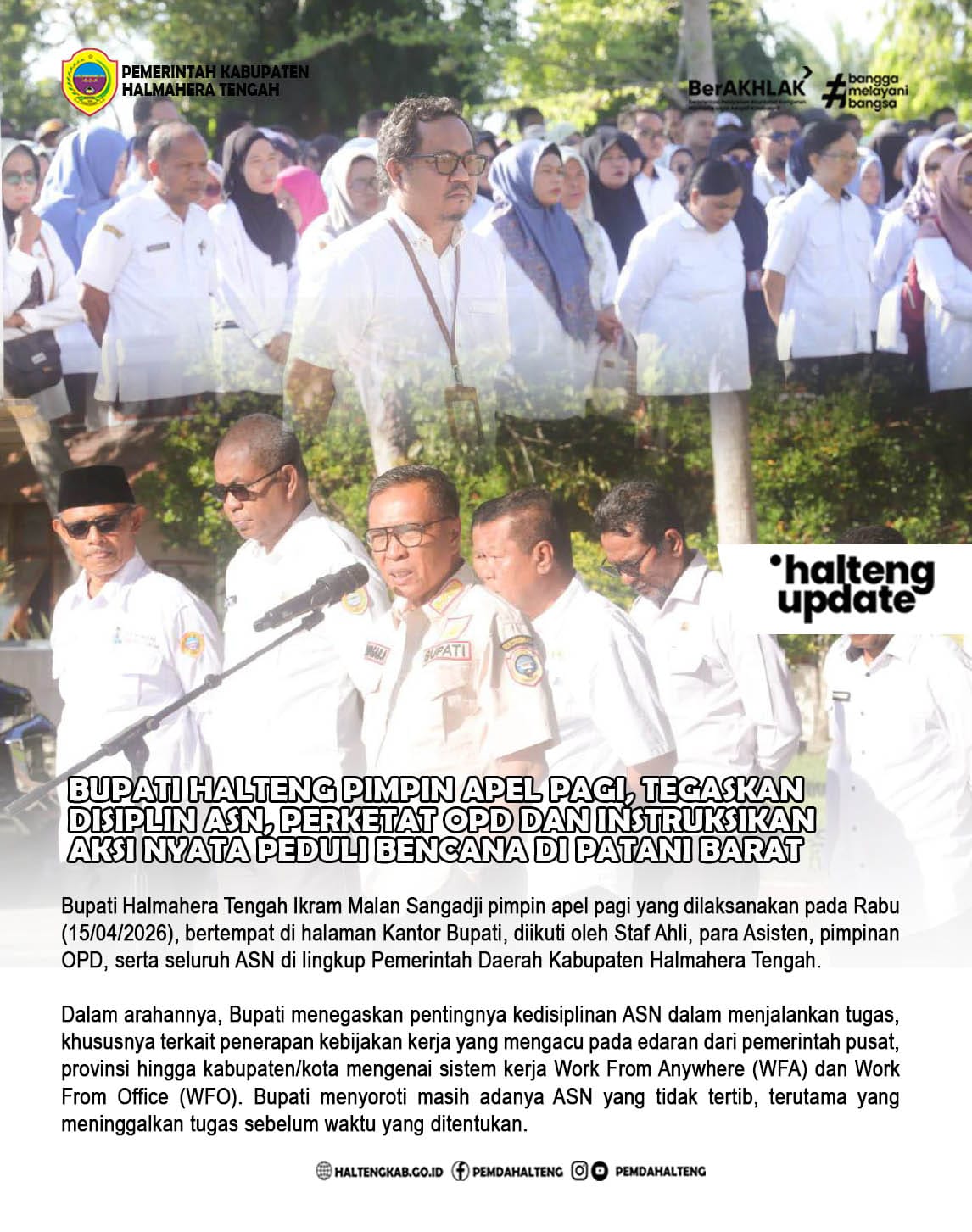 Bupati Halmahera Tengah Ikram Malan Sangadji pimpin apel pagi yang dilaksanakan pada Rabu (15/04/2026), bertempat di halaman Kantor Bupati, diikuti oleh Staf Ahli, para Asisten, pimpinan OPD, serta seluruh ASN di lingkup Pemerintah Daerah Kabupaten Halmahera Tengah. Dalam arahannya,