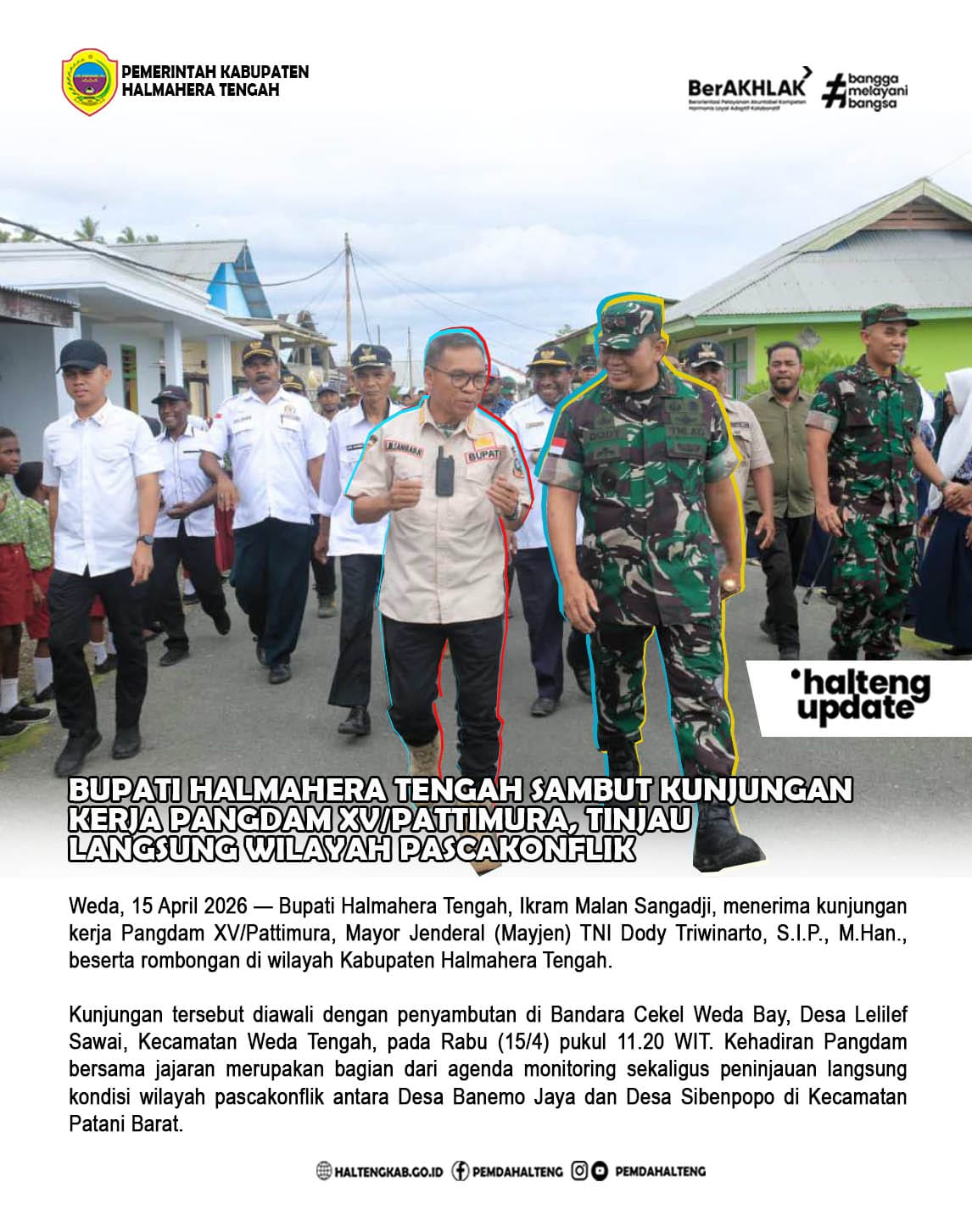 Weda, 15 April 2026 — Bupati Halmahera Tengah, Ikram Malan Sangadji, menerima kunjungan kerja Pangdam XV/Pattimura, Mayor Jenderal (Mayjen) TNI Dody Triwinarto, S.I.P., M.Han., beserta rombongan di wilayah Kabupaten Halmahera Tengah. Kunjungan tersebut diawali dengan penyambutan di Bandara Cekel