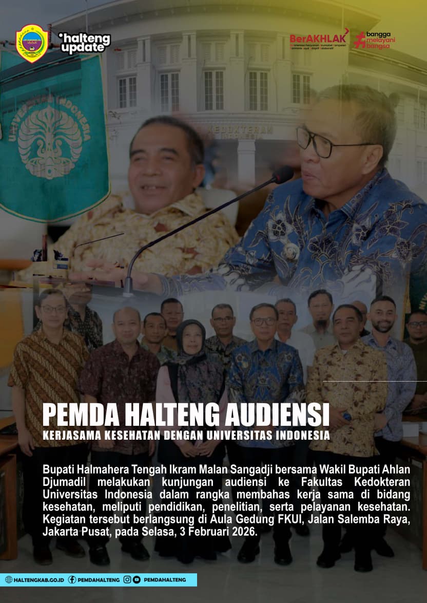 Jakarta – Bupati Halmahera Tengah Ikram Malan Sangadji bersama Wakil Bupati Ahlan Djumadil melakukan kunjungan audiensi ke Fakultas Kedokteran Universitas Indonesia dalam rangka membahas kerja sama di bidang kesehatan, meliputi pendidikan, penelitian, serta pelayanan kesehatan. Kegiatan tersebut berlangsung di Aula Gedung FKUI, Jalan Salemba Raya, Jakarta Pusat, pada Selasa, 3 Februari 2026.