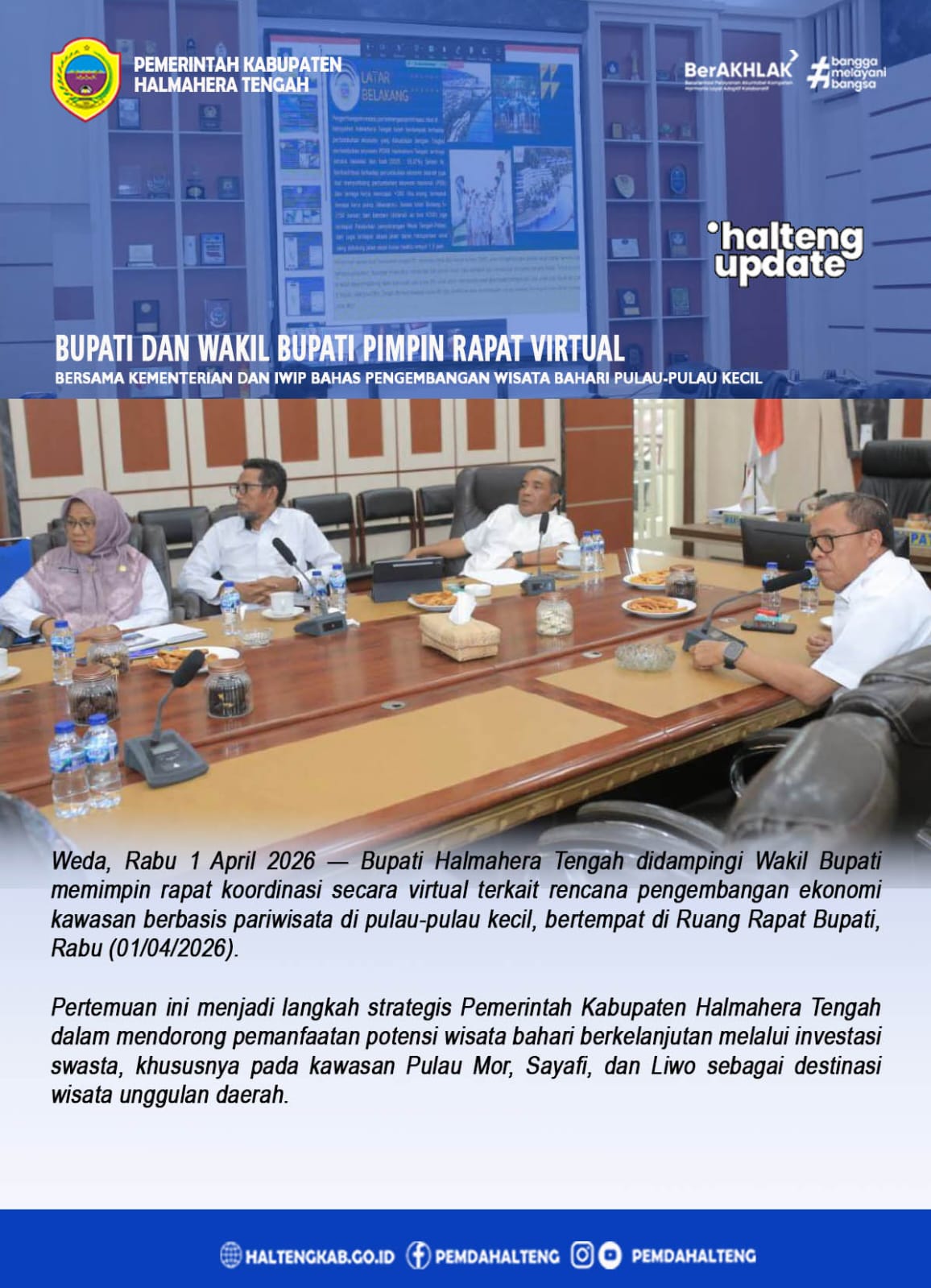 Weda, Rabu 1 April 2026 — Bupati Halmahera Tengah didampingi Wakil Bupati memimpin rapat koordinasi secara virtual terkait rencana pengembangan ekonomi kawasan berbasis pariwisata di pulau-pulau kecil, bertempat di Ruang Rapat Bupati, Rabu (01/04/2026).