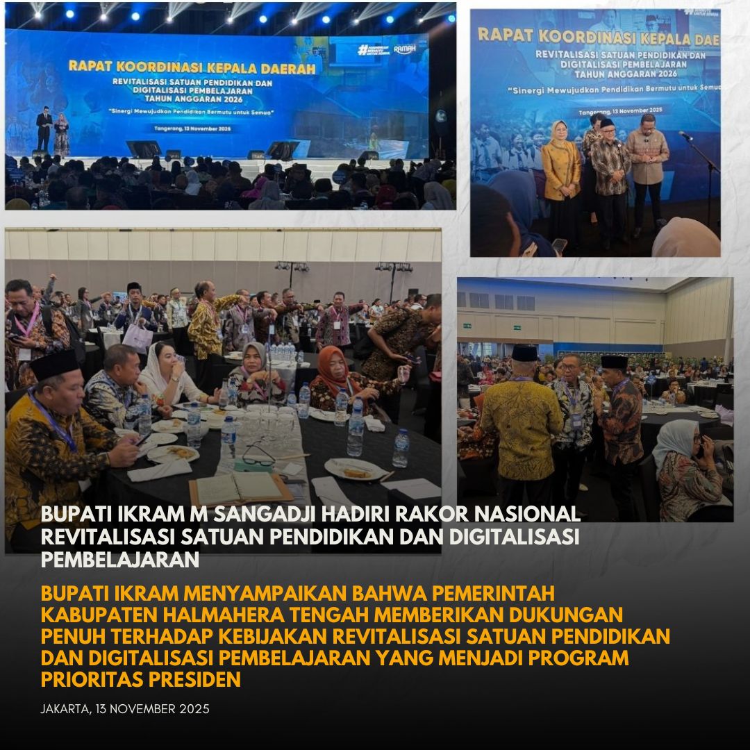 Bupati Halmahera Tengah, Ikram Malan Sangadji, menghadiri Rapat Koordinasi Kepala Daerah tentang Revitalisasi Satuan Pendidikan dan Digitalisasi Pembelajaran yang diselenggarakan oleh Kementerian Pendidikan, Kebudayaan, Riset, dan Teknologi di ICE BSD Hall 3, Tangerang.