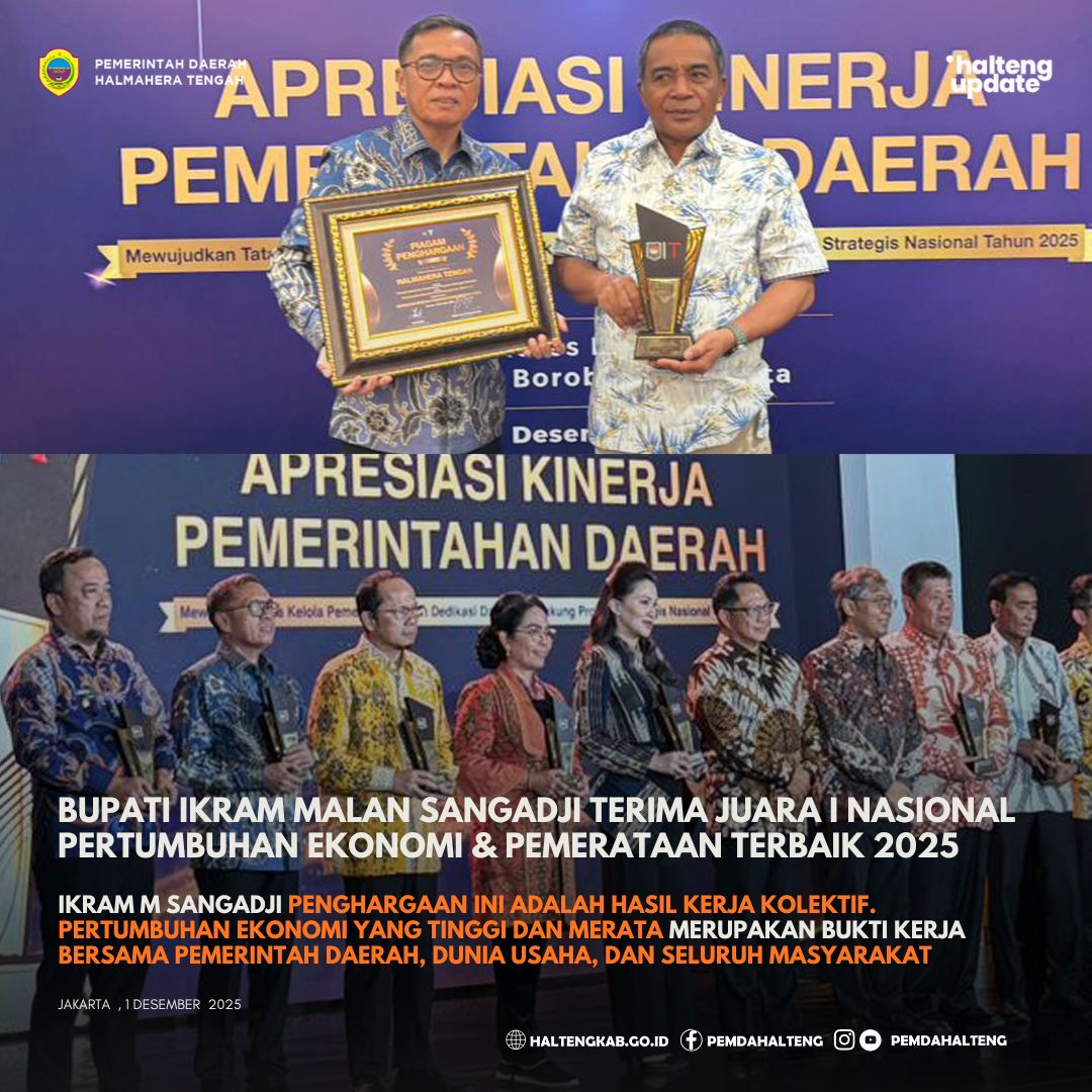 Jakarta, 1 Desember 2025. Kabupaten Halmahera Tengah meraih Juara I Nasional untuk Kategori Pertumbuhan Ekonomi Tertinggi dan Pemerataan Ekonomi Terbaik pada ajang Apresiasi Kinerja Pemerintahan Daerah (AKPD) 2025 yang digelar di Hotel Borobudur Jakarta. Penghargaan diserahkan langsung oleh Mendagri Muhammad Tito Karnavian kepada Bupati Halmahera Tengah Ikram Malan Sangadji, yang hadir bersama Wakil Bupati Ahlan Djumadil, Kabag Adbang Abubakar Ibrahim dan Kabag Umum Setda Halteng Indra Ayu.