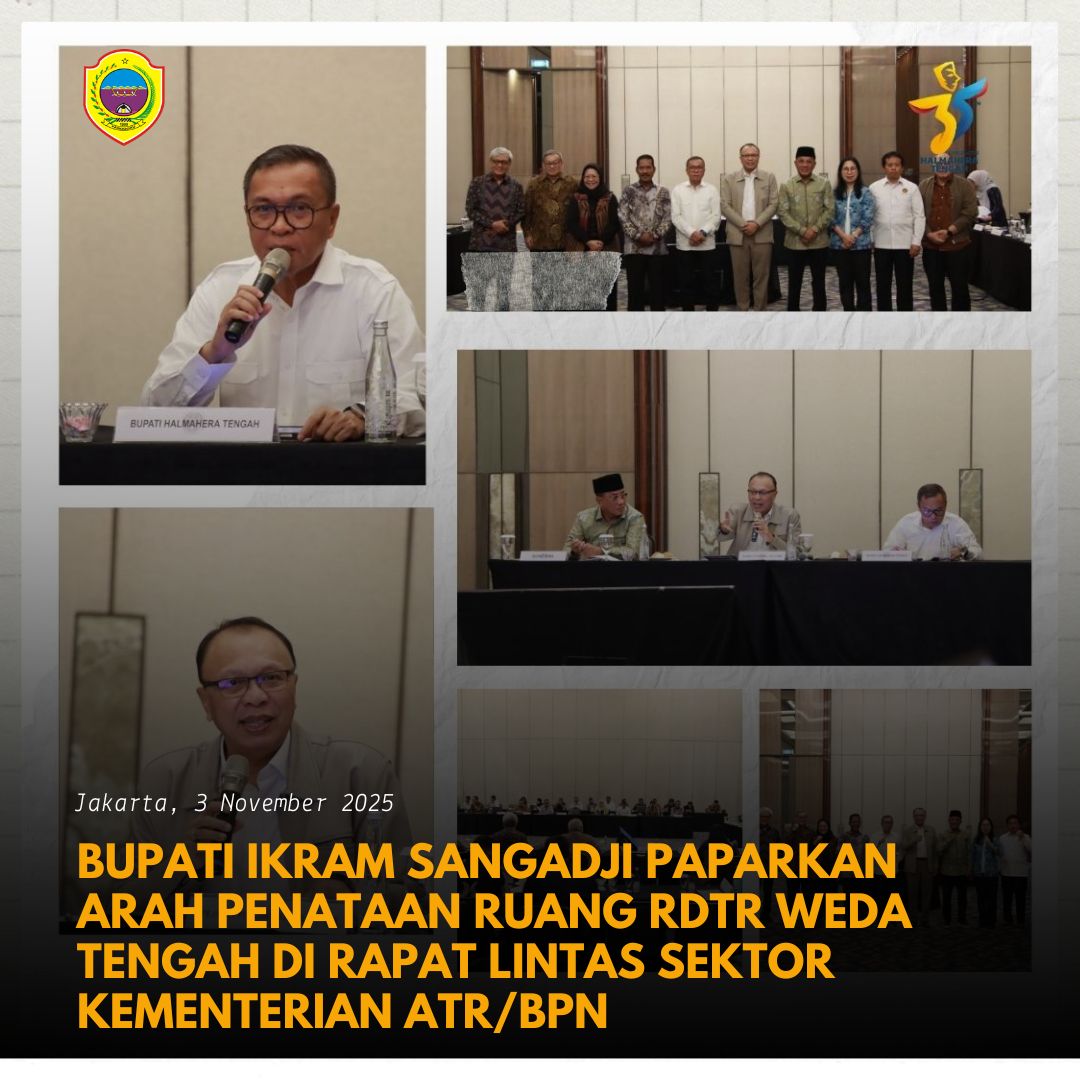 Jakarta, 3 November 2025 — Pemerintah Daerah Kabupaten Halmahera Tengah menghadiri Rapat Koordinasi Lintas Sektor (Linsek) pembahasan Rancangan Peraturan Kepala Daerah (Ranperkada) Rencana Detail Tata Ruang (RDTR) Wilayah Perencanaan Weda Tengah, yang diselenggarakan oleh Kementerian Agraria dan Tata Ruang/Badan Pertanahan Nasional (ATR/BPN) di Hotel Sheraton, Jakarta, pada Senin (3/11/2025).