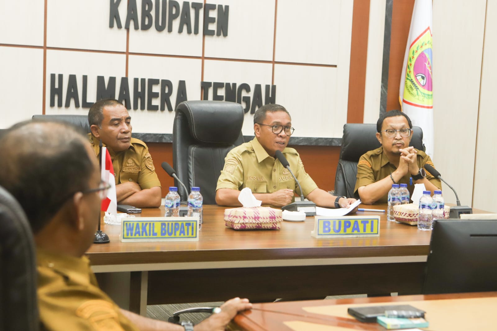 Bupati Halmahera Tengah Ikram Malan Sangadji bersama Wakil Bupati Ahlan djumadil mengikuti rapat bersama Wakil Gubernur Maluku Utara Sarbin Sehe dan Direktur Bulog RI. Rapat yang di laksanakan secara virtual bertempat di Ruang Rapat Bupati Selasa 7 Oktober 2025, juga