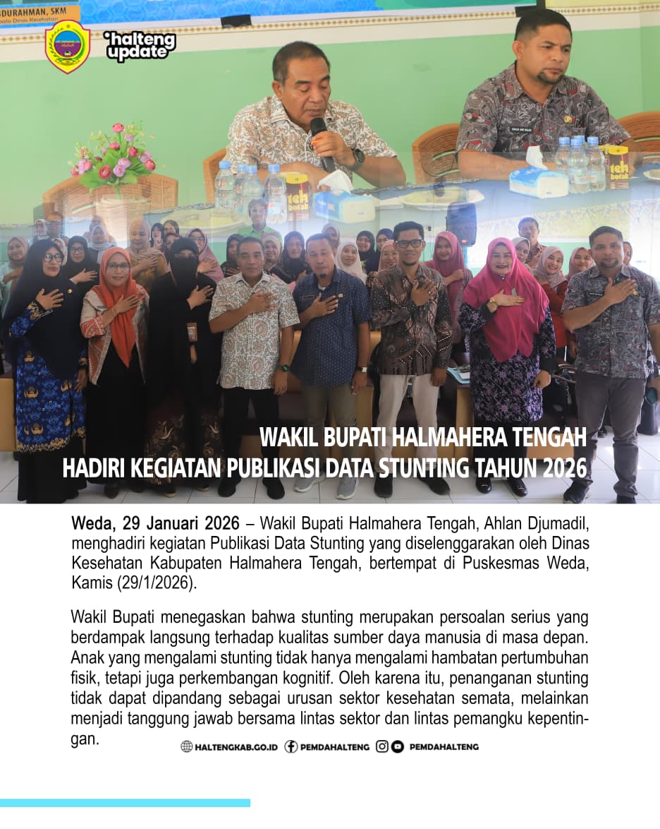 Weda, 29 Januari 2026 – Wakil Bupati Halmahera Tengah, Ahlan Djumadil, menghadiri kegiatan Publikasi Data Stunting yang diselenggarakan oleh Dinas Kesehatan Kabupaten Halmahera Tengah, bertempat di Puskesmas Weda, Kamis (29/1/2026). Dalam sambutannya, Wakil Bupati Ahlan Djumadil menyampaikan bahwa arah