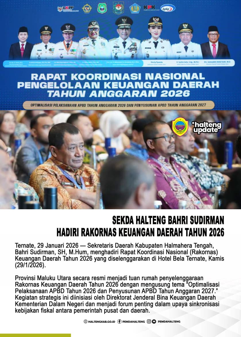 Ternate, 29 Januari 2026 — Sekretaris Daerah Kabupaten Halmahera Tengah, Bahri Sudirman, SH, M.Hum, menghadiri Rapat Koordinasi Nasional (Rakornas) Keuangan Daerah Tahun 2026 yang diselenggarakan di Hotel Bela Ternate, Kamis (29/1/2026). Provinsi Maluku Utara secara resmi menjadi tuan rumah