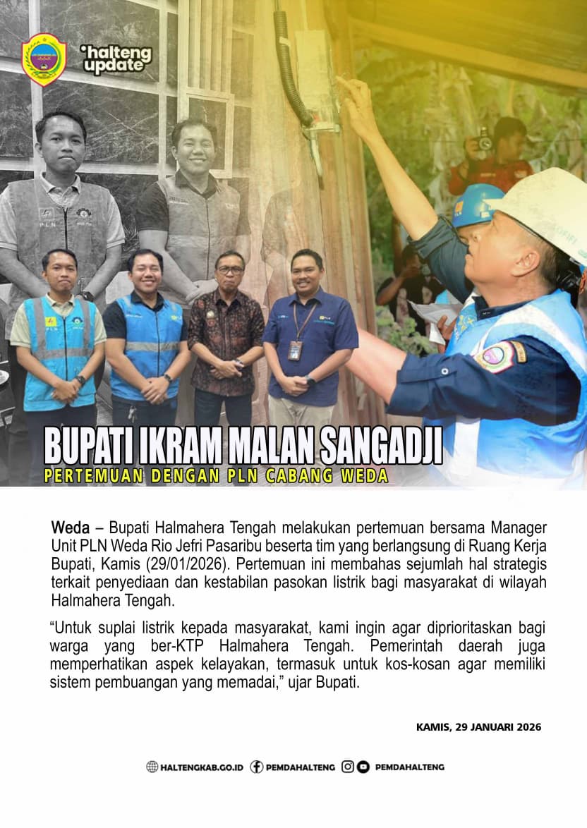 Weda – Bupati Halmahera Tengah melakukan pertemuan bersama Manager Unit PLN Weda Rio Jefri Pasaribu beserta tim yang berlangsung di Ruang Kerja Bupati, Kamis (29/01/2026). Pertemuan ini membahas sejumlah hal strategis terkait penyediaan dan kestabilan pasokan listrik bagi masyarakat di