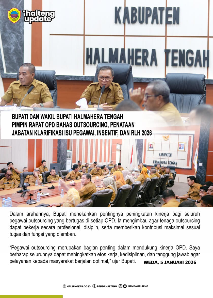 BUPATI DAN WAKIL BUPATI HALMAHERA TENGAH PIMPIN RAPAT OPD BAHAS OUTSOURCING, PENATAAN JABATAN, KLARIFIKASI ISU PEGAWAI, INSENTIF, DAN RLH 2026