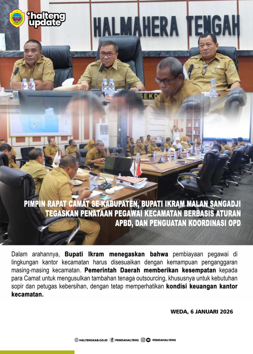 Ternate — Bupati Halmahera Tengah, Ikram Malan Sangadji, memberikan arahan tegas kepada seluruh pimpinan Organisasi Perangkat Daerah (OPD) agar segera menata kembali lanskap dan tata ruang kantor masing-masing. Arahan tersebut disampaikan dalam pertemuan bersama pimpinan OPD yang berlangsung di Bella