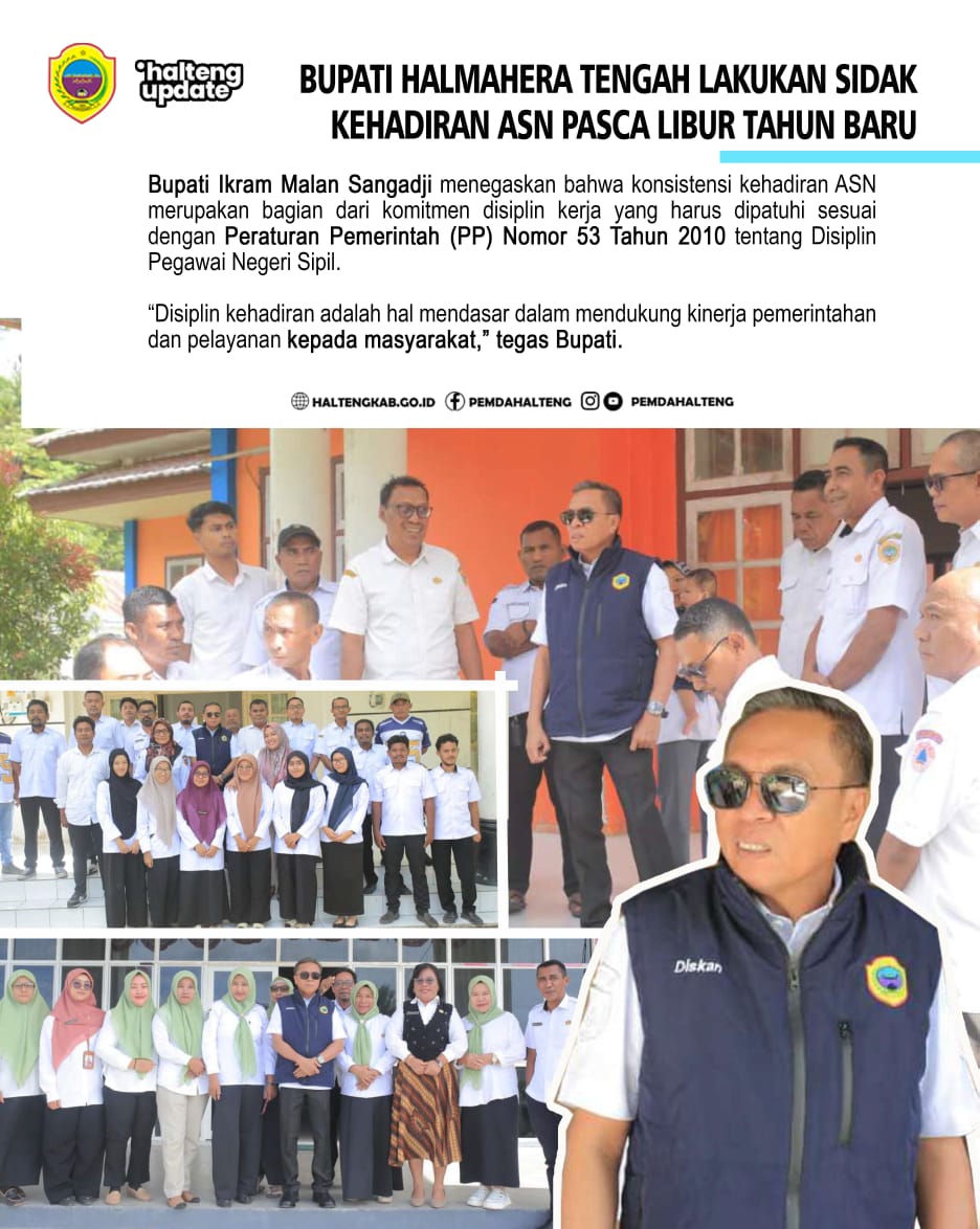 Weda —Bupati Halmahera Tengah, Ikram Malan Sangadji, melakukan inspeksi mendadak (sidak) terkait kehadiran Aparatur Sipil Negara (ASN) dan pegawai outsourcing di sejumlah dinas yang berlokasi di KM 3, Kecamatan Weda, pasca libur Tahun Baru.”Rabu 7 Januari 2026 Dalam sidak