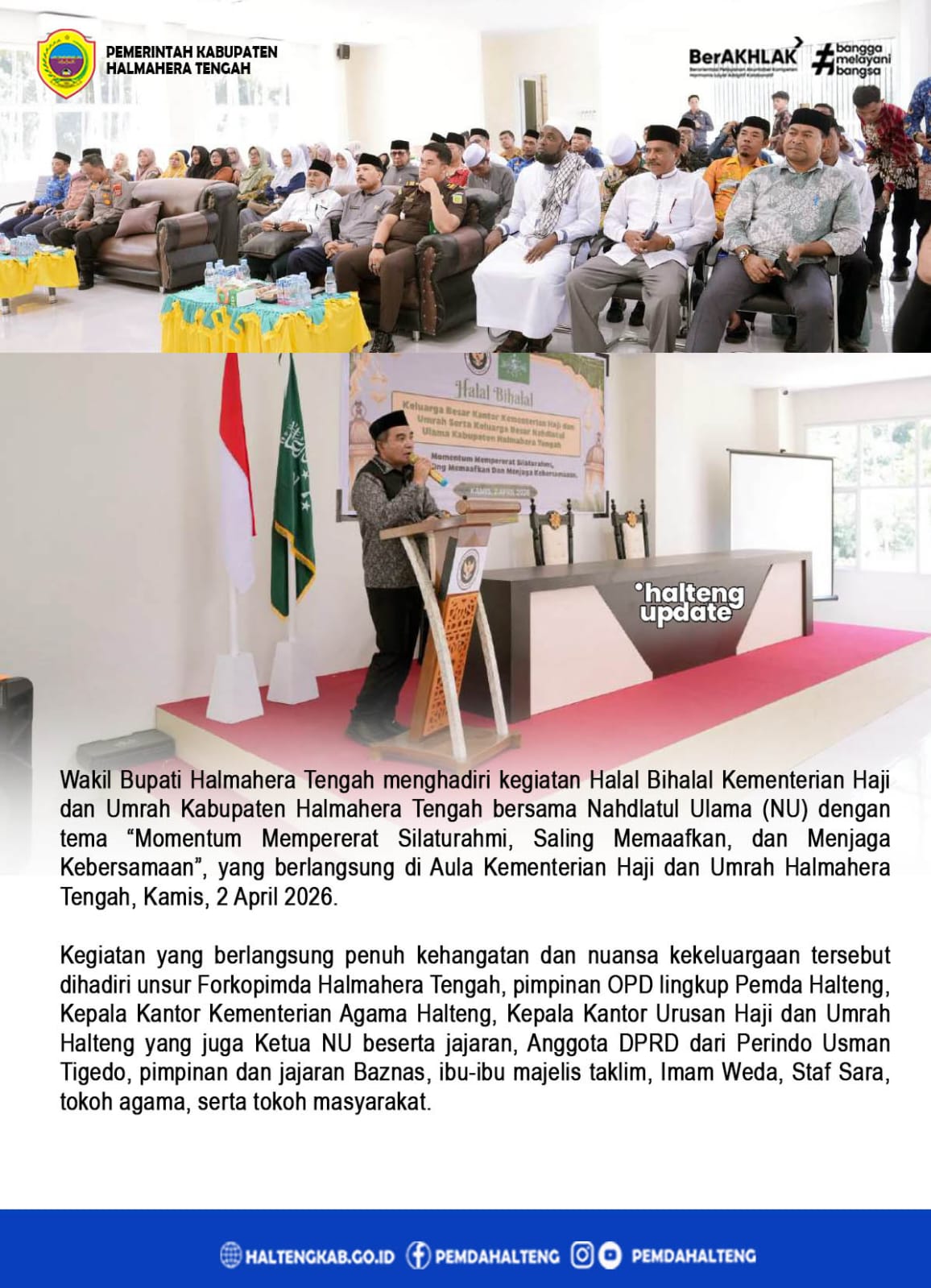 Wakil Bupati Halmahera Tengah menghadiri kegiatan Halal Bihalal Kementerian Haji dan Umrah Kabupaten Halmahera Tengah bersama Nahdlatul Ulama (NU) dengan tema “Momentum Mempererat Silaturahmi, Saling Memaafkan, dan Menjaga Kebersamaan”, yang berlangsung di Aula Kementerian Haji dan Umrah Halmahera Tengah, Kamis,