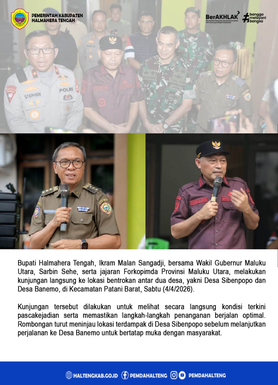Bupati Halmahera Tengah, Ikram Malan Sangadji, bersama Wakil Gubernur Maluku Utara, Sarbin Sehe, serta jajaran Forkopimda Provinsi Maluku Utara, melakukan kunjungan langsung ke lokasi bentrokan antar dua desa, yakni Desa Sibenpopo dan Desa Banemo, di Kecamatan Patani Barat, Sabtu (4/4/2026).