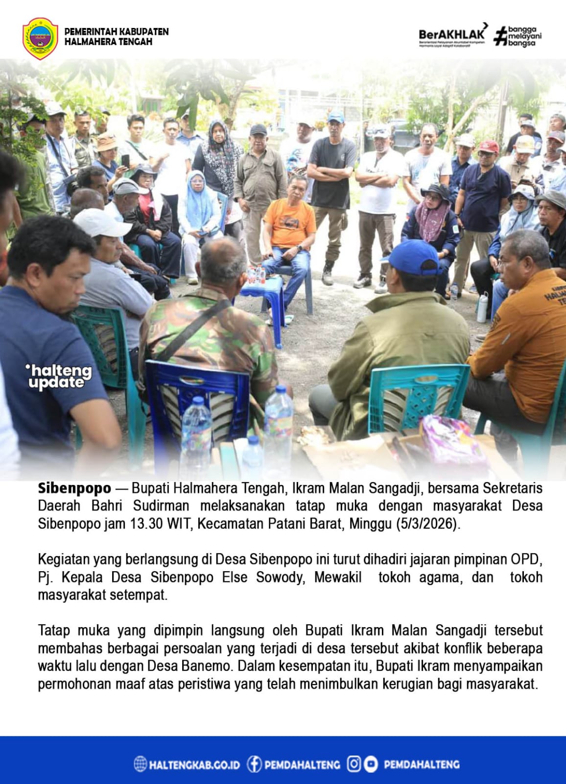 Sibenpopo — Bupati Halmahera Tengah, Ikram Malan Sangadji, bersama Sekretaris Daerah Bahri Sudirman melaksanakan tatap muka dengan masyarakat Desa Sibenpopo jam 13.30 WIT, Kecamatan Patani Barat, Minggu (5/3/2026). Kegiatan yang berlangsung di Desa Sibenpopo ini turut dihadiri jajaran pimpinan