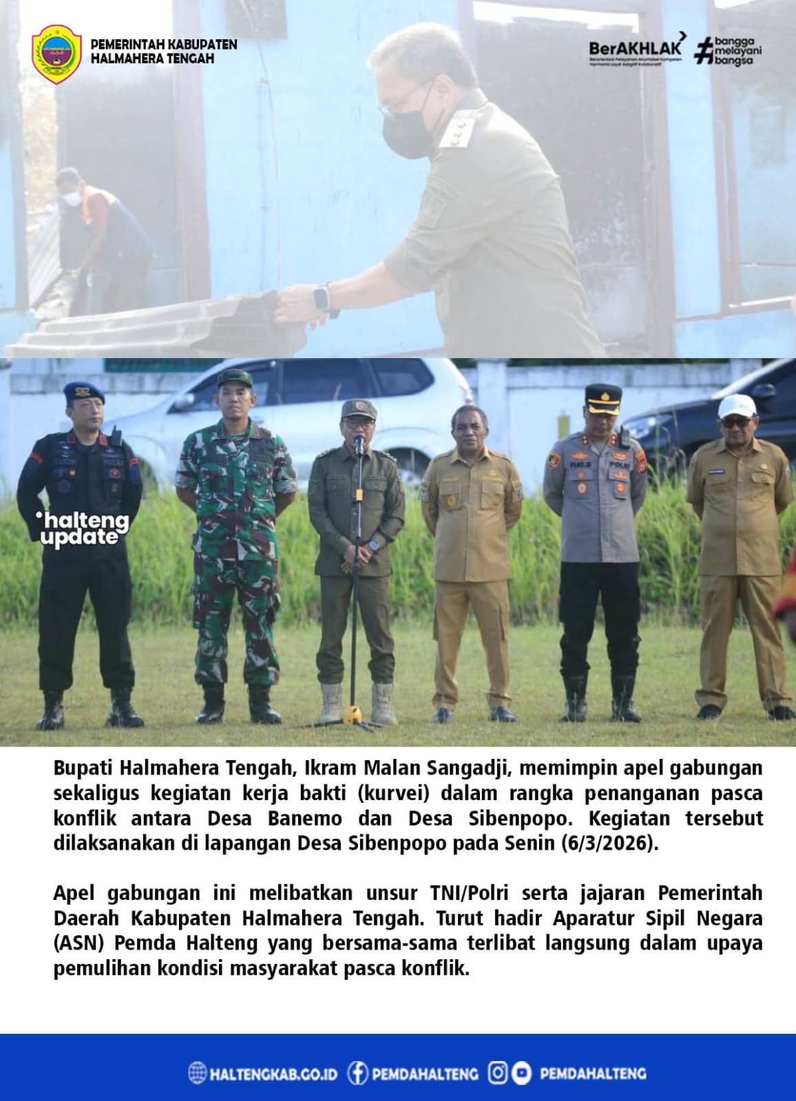 Bupati Halmahera Tengah, Ikram Malan Sangadji, memimpin apel gabungan sekaligus kegiatan kerja bakti (kurvei) dalam rangka penanganan pasca konflik antara Desa Banemo dan Desa Sibenpopo. Kegiatan tersebut dilaksanakan di lapangan Desa Sibenpopo pada Senin (6/3/2026). Apel gabungan ini melibatkan