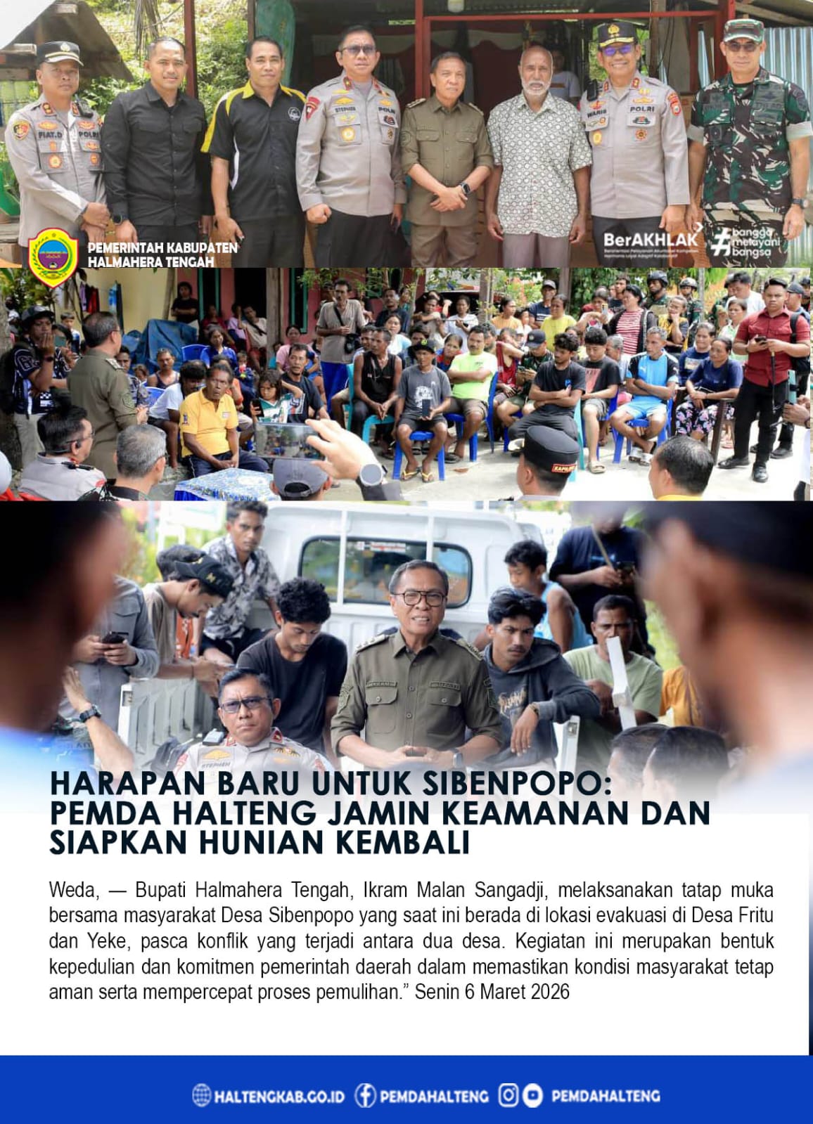 Weda, — Bupati Halmahera Tengah, Ikram Malan Sangadji, melaksanakan tatap muka bersama masyarakat Desa Sibenpopo yang saat ini berada di lokasi evakuasi di Desa Fritu dan Yeke, pasca konflik yang terjadi antara dua desa. Kegiatan ini merupakan bentuk kepedulian dan