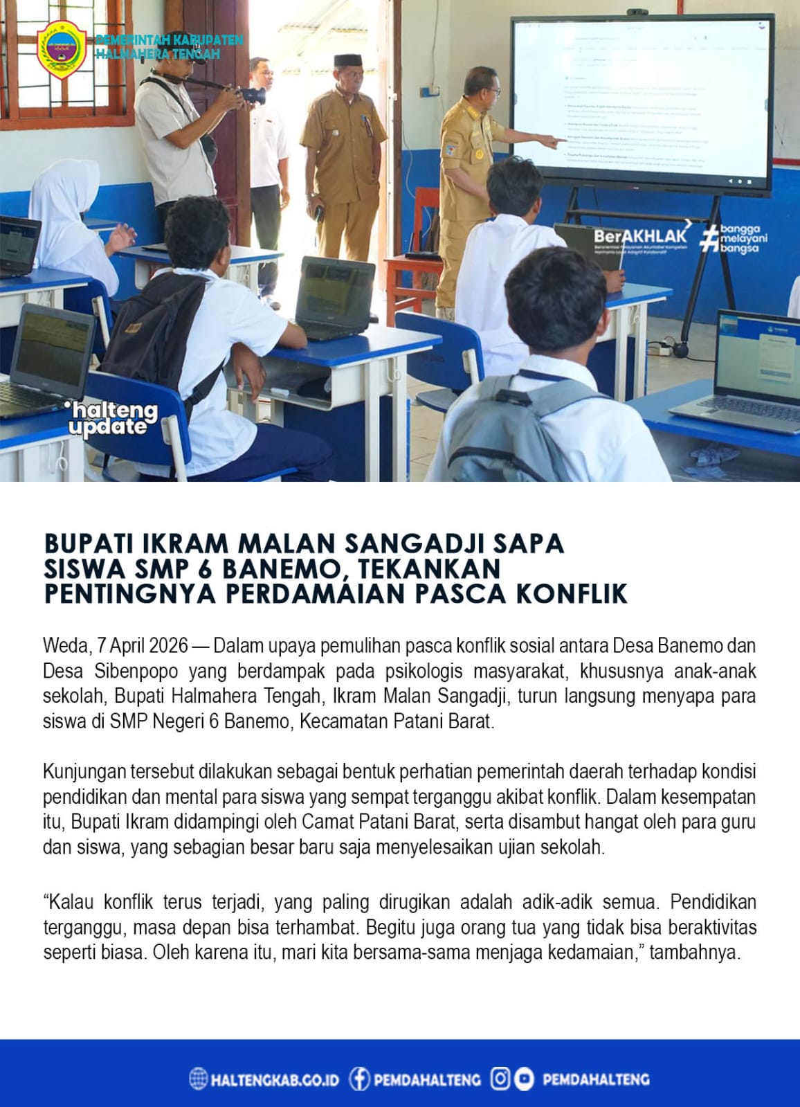 Weda, 7 April 2026 — Dalam upaya pemulihan pasca konflik sosial antara Desa Banemo dan Desa Sibenpopo yang berdampak pada psikologis masyarakat, khususnya anak-anak sekolah, Bupati Halmahera Tengah, Ikram Malan Sangadji, turun langsung menyapa para siswa di SMP Negeri 6