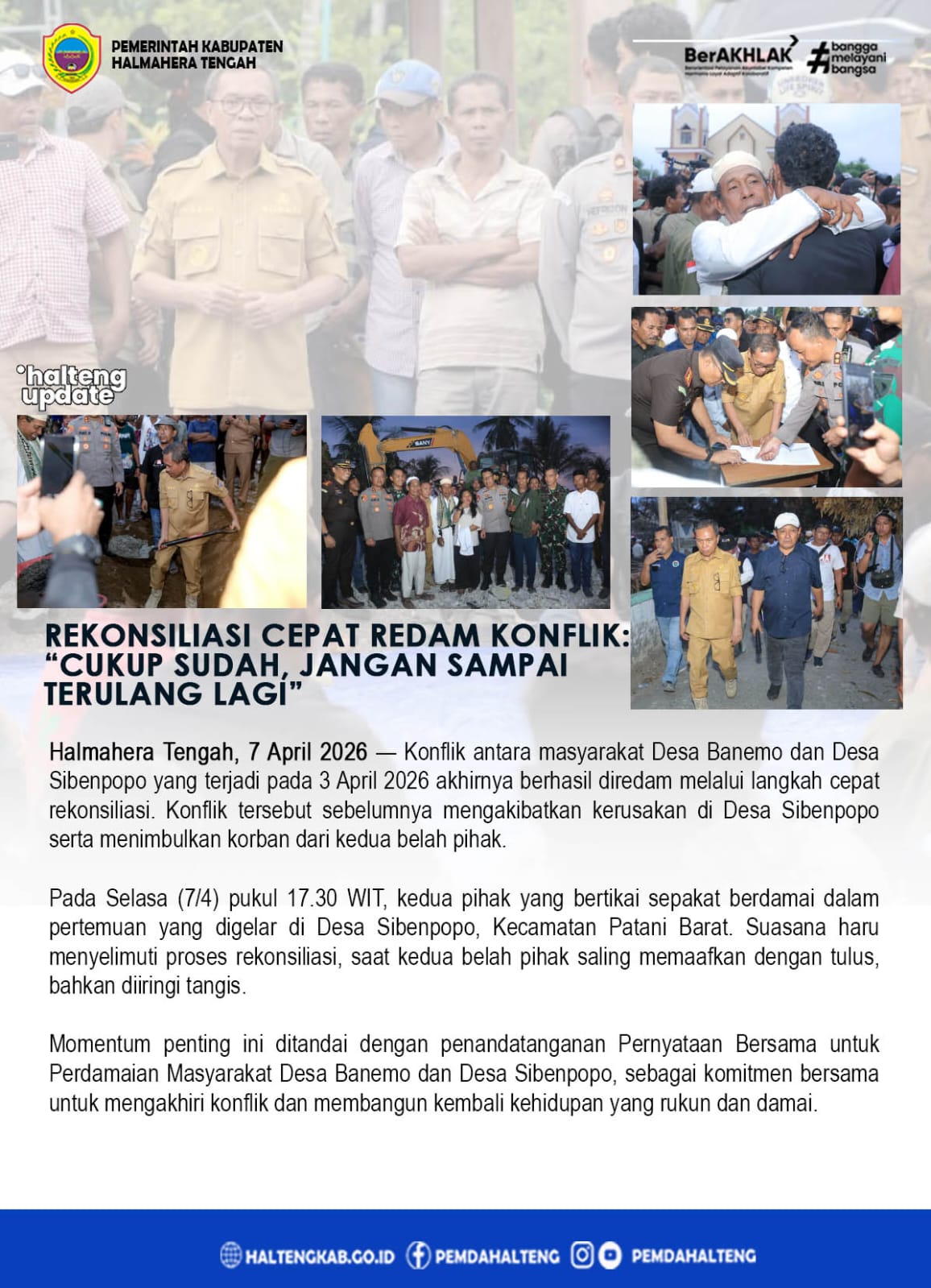 Halmahera Tengah, 7 April 2026 — Konflik antara masyarakat Desa Banemo dan Desa Sibenpopo yang terjadi pada 3 April 2026 akhirnya berhasil diredam melalui langkah cepat rekonsiliasi. Konflik tersebut sebelumnya mengakibatkan kerusakan di Desa Sibenpopo serta menimbulkan korban dari kedua
