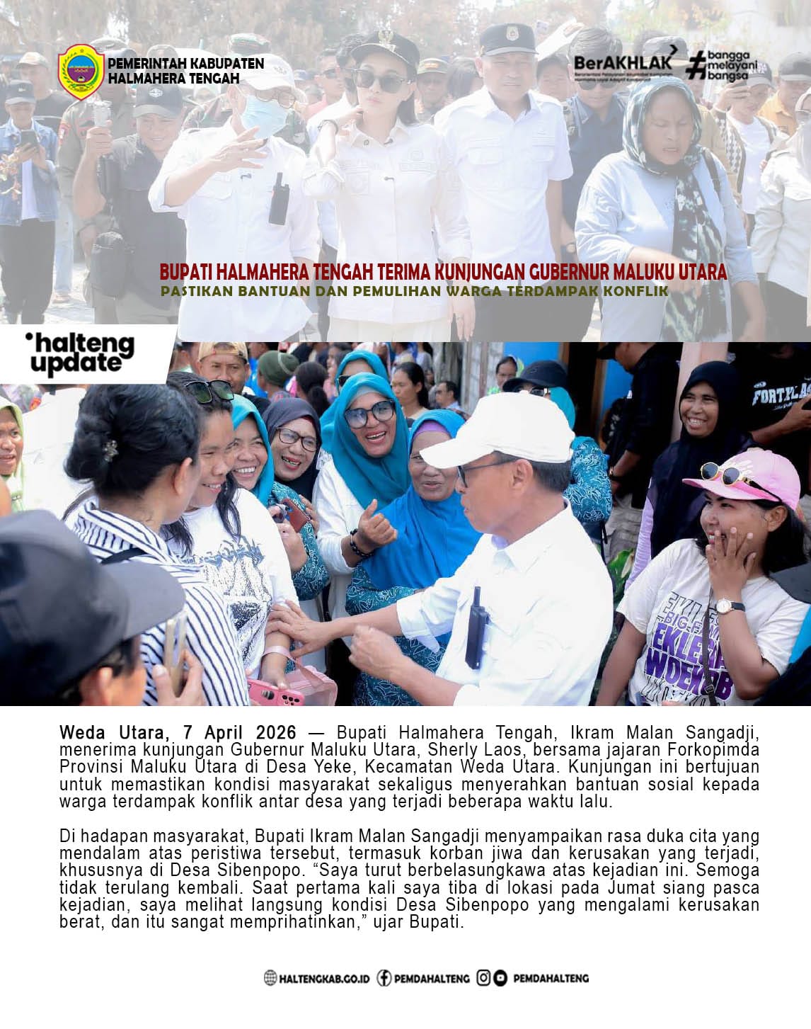 Weda Utara, 7 April 2026 — Bupati Halmahera Tengah, Ikram Malan Sangadji, menerima kunjungan Gubernur Maluku Utara, Sherly Laos, bersama jajaran Forkopimda Provinsi Maluku Utara di Desa Yeke, Kecamatan Weda Utara. Kunjungan dan tatapmuka bersama Masyarakat sibenpopo ini bertujuan untuk