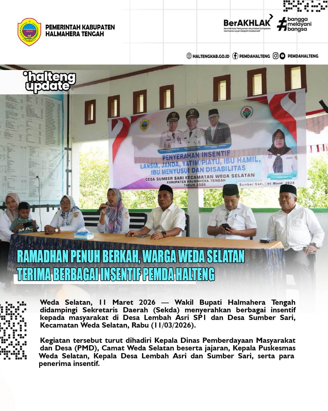 Weda Selatan, 11 Maret 2026 — Wakil Bupati Halmahera Tengah didampingi Sekretaris Daerah (Sekda) menyerahkan berbagai insentif kepada masyarakat di Desa Lembah Asri SP1 dan Desa Sumber Sari, Kecamatan Weda Selatan, Rabu (11/03/2026). Kegiatan tersebut turut dihadiri Kepala Dinas
