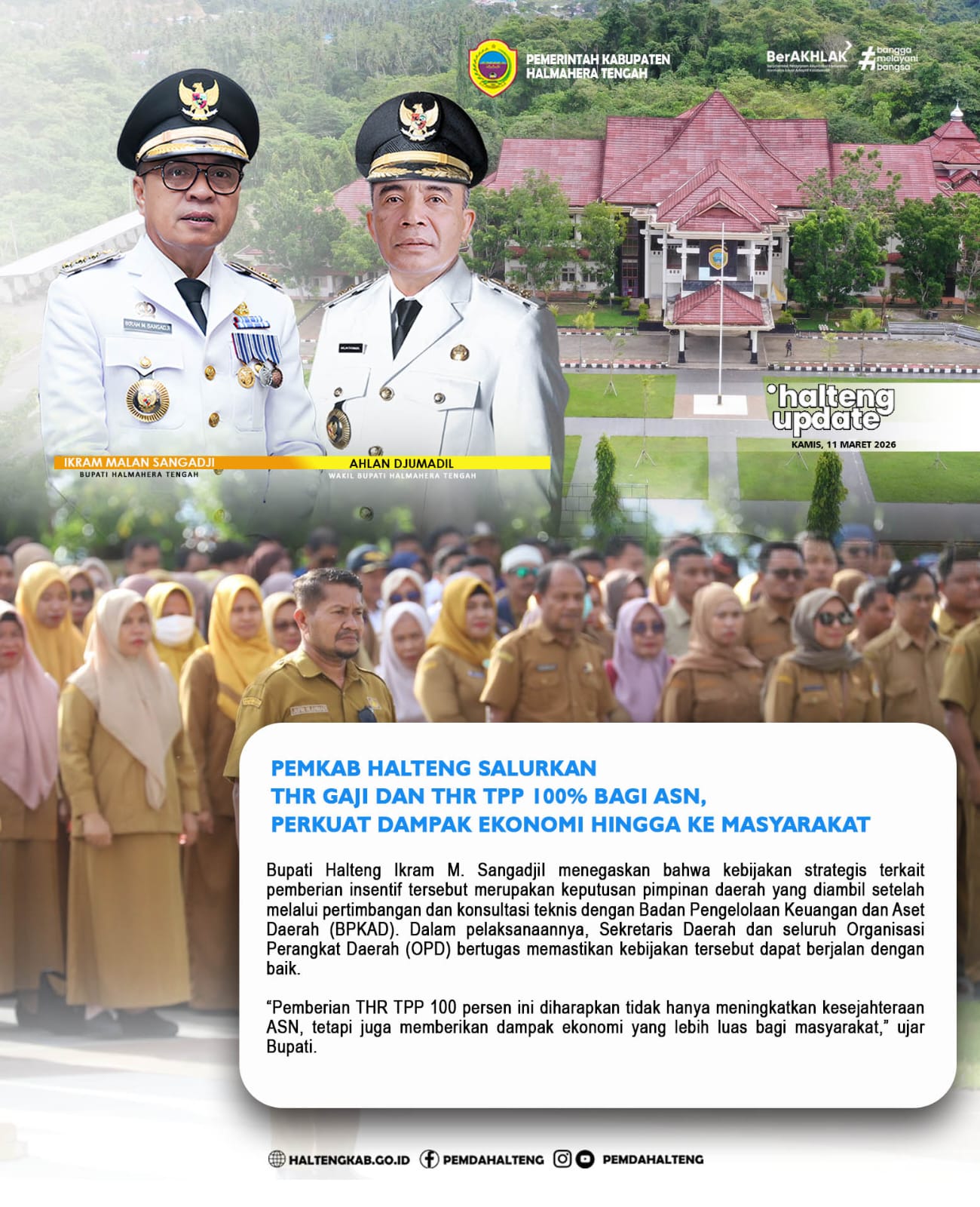 Weda, 11 Maret 2026 — Pemerintah Kabupaten Halmahera Tengah menyalurkan Tunjangan Hari Raya (THR) bagi Aparatur Sipil Negara (ASN) yang terdiri dari THR Gaji serta THR Tambahan Penghasilan Pegawai (TPP) sebesar 100 persen. Kebijakan ini merupakan komitmen Bupati Halmahera Tengah