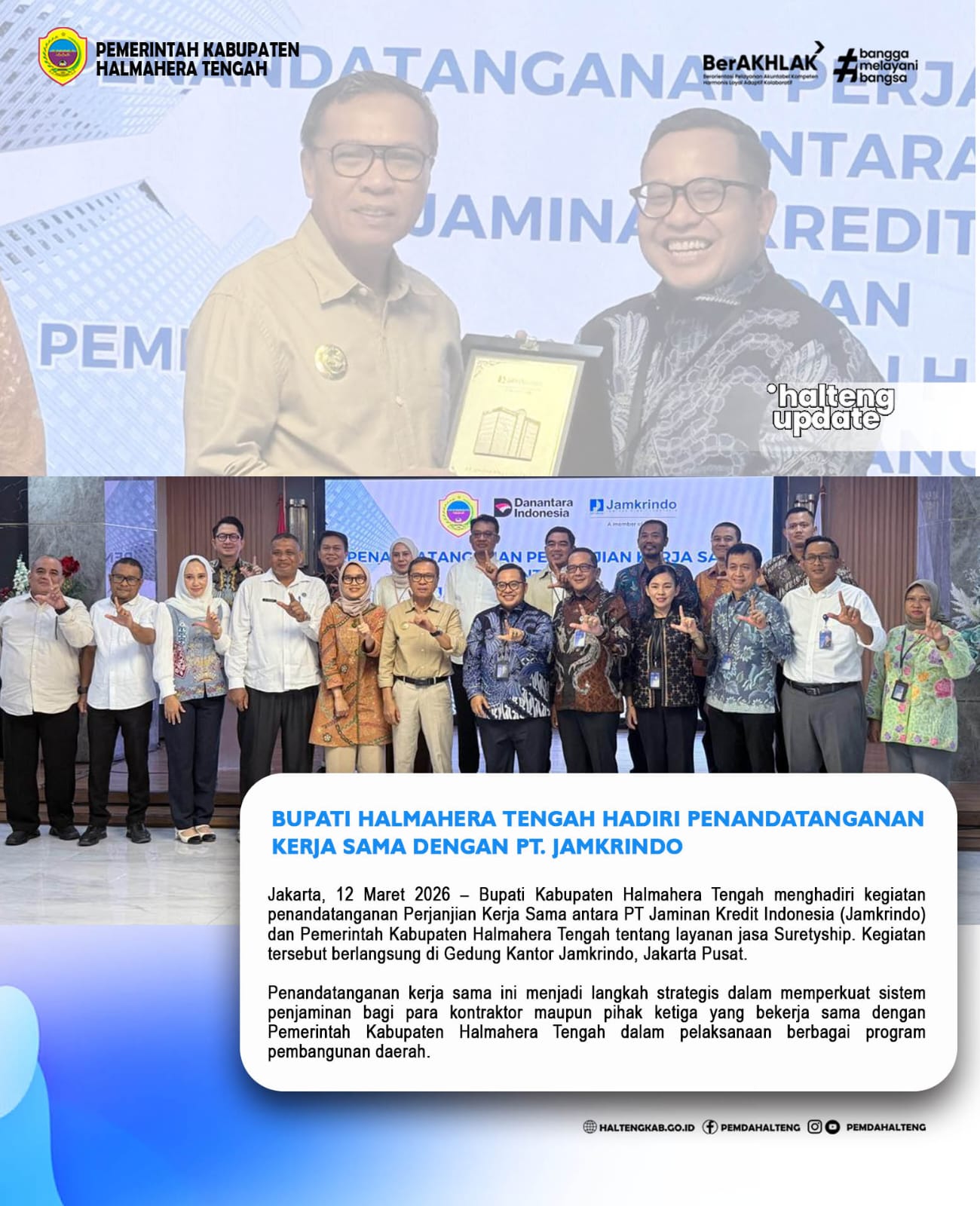 Jakarta, 12 Maret 2026 – Bupati Kabupaten Halmahera Tengah menghadiri kegiatan penandatanganan Perjanjian Kerja Sama antara PT Jaminan Kredit Indonesia (Jamkrindo) dan Pemerintah Kabupaten Halmahera Tengah tentang layanan jasa Suretyship. Kegiatan tersebut berlangsung di Gedung Kantor Jamkrindo, Jakarta Pusat.