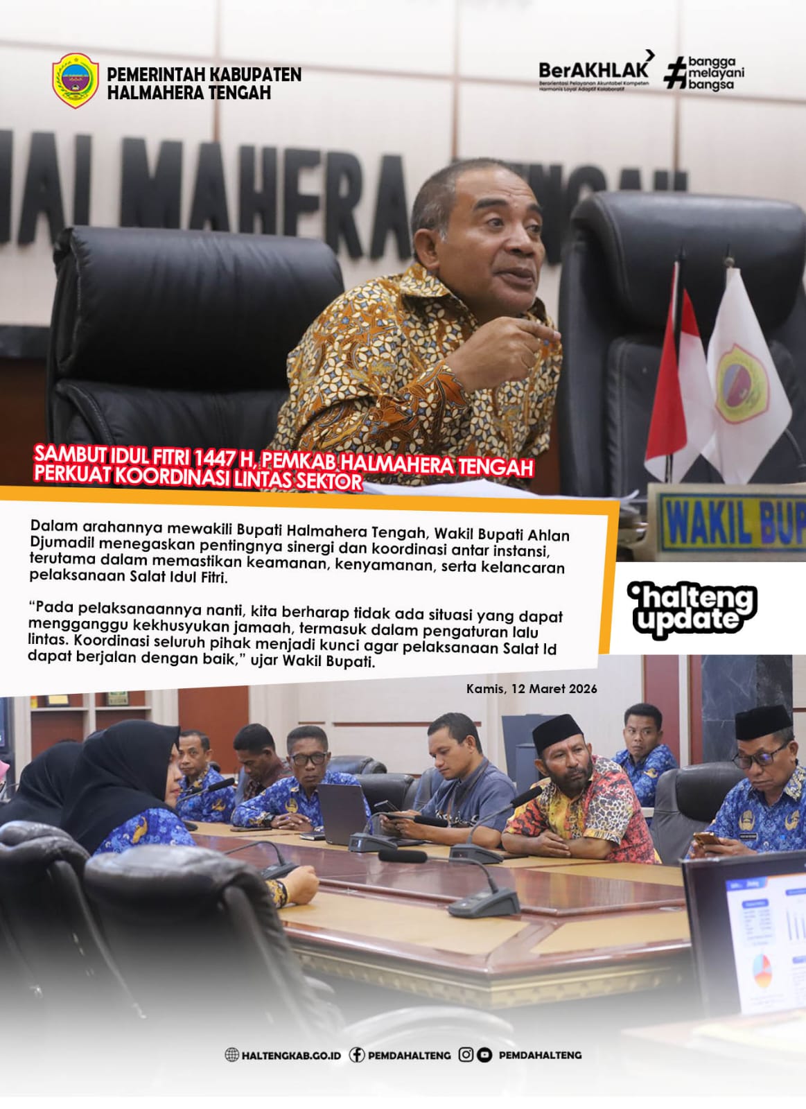 Weda, 12 Maret 2026 – Pemerintah Kabupaten Halmahera Tengah menggelar rapat koordinasi lintas sektor guna mematangkan persiapan pelaksanaan Salat Idul Fitri 1447 Hijriah/2026 M. Rapat yang berlangsung pada Kamis (12/03) pukul 13.00 WIT tersebut dipimpin langsung oleh Wakil Bupati Halmahera
