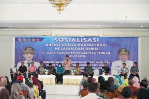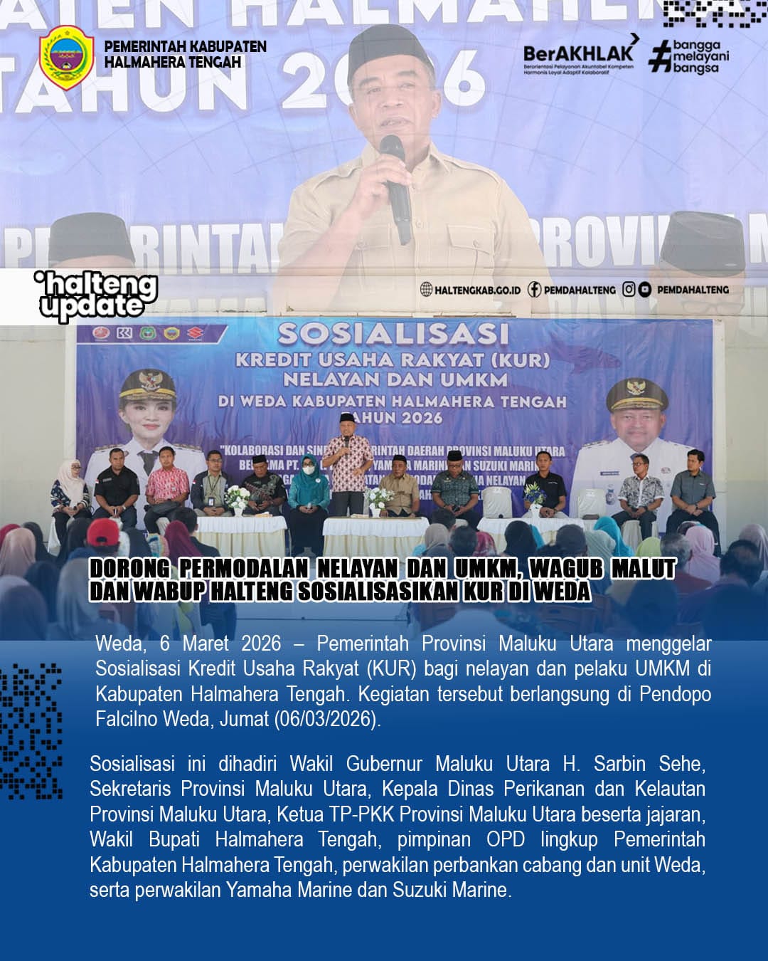 Weda, 6 Maret 2026 – Pemerintah Provinsi Maluku Utara menggelar Sosialisasi Kredit Usaha Rakyat (KUR) bagi nelayan dan pelaku UMKM di Kabupaten Halmahera Tengah. Kegiatan tersebut berlangsung di Pendopo Falcilno Weda, Jumat (06/03/2026).