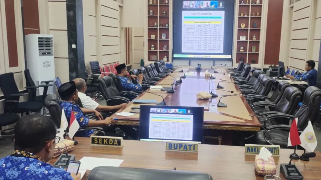 Weda, 1 Oktober 2025 – Pemerintah Provinsi Maluku Utara menggelar evaluasi Program Pemeriksaan Kesehatan Gratis (PKG) secara virtual melalui Zoom Meeting, Rabu (1/10/2025). Pertemuan yang dipusatkan di Ruang Rapat Bupati Halmahera Tengah ini diikuti Wakil Bupati Halmahera Tengah, Sekretaris Daerah Halteng, Kepala Dinas PMD, Plt. Kadis Kesehatan, dan Kabid Kesehatan Masyarakat Dinas Kesehatan Halteng.