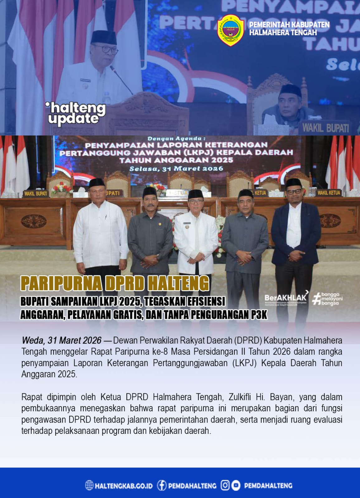 Weda, 31 Maret 2026 — Dewan Perwakilan Rakyat Daerah (DPRD) Kabupaten Halmahera Tengah menggelar Rapat Paripurna ke-8 Masa Persidangan II Tahun 2026 dalam rangka penyampaian Laporan Keterangan Pertanggungjawaban (LKPJ) Kepala Daerah Tahun Anggaran 2025.