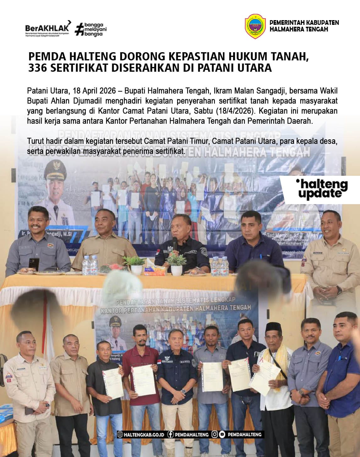Patani Utara, 18 April 2026 – Bupati Halmahera Tengah, Ikram Malan Sangadji, bersama Wakil Bupati Ahlan Djumadil menghadiri kegiatan penyerahan sertifikat tanah kepada masyarakat yang berlangsung di Kantor Camat Patani Utara, Sabtu (18/4/2026). Kegiatan ini merupakan hasil kerja sama antara Kantor Pertanahan Halmahera Tengah dan Pemerintah Daerah.