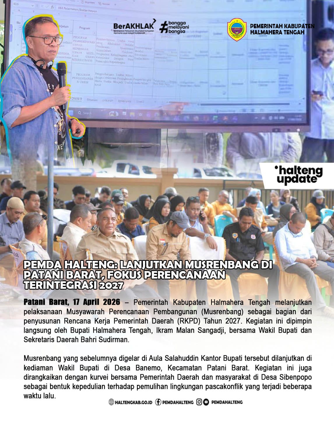 Patani Barat, 17 April 2026 – Pemerintah Kabupaten Halmahera Tengah melanjutkan pelaksanaan Musyawarah Perencanaan Pembangunan (Musrenbang) sebagai bagian dari penyusunan Rencana Kerja Pemerintah Daerah (RKPD) Tahun 2027. Kegiatan ini dipimpin langsung oleh Bupati Halmahera Tengah, Ikram Malan Sangadji, bersama Wakil Bupati Ahlan Djumadil dan Sekretaris Daerah Bahri Sudirman.