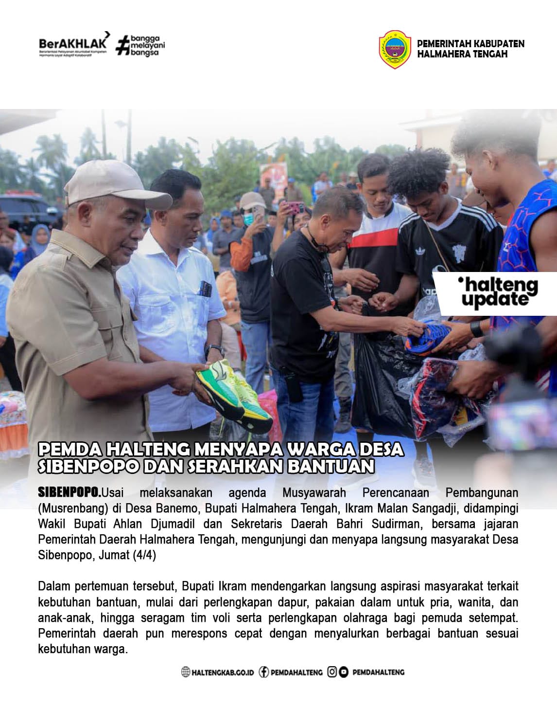 “Pada hari ini, saya bersama Wakil Bupati, Sekda, dan seluruh jajaran Pemda Halteng hadir langsung untuk menyerahkan bantuan kepada bapak dan ibu. Semoga bantuan ini dapat bermanfaat,” ujar Bupati Ikram di hadapan masyarakat.