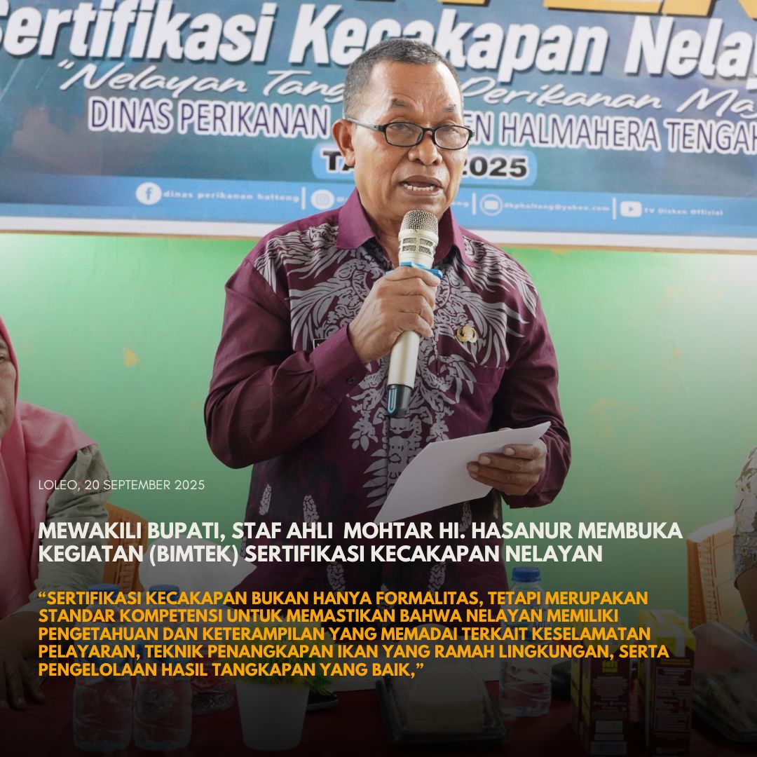 Mewakili Bupati Ikram Malan Sangadji, Staf Ahli Bidang Pembangunan Mohtar Hi. Hasanur membuka kegiatan Bimbingan Teknis (Bimtek) Sertifikasi Kecakapan Nelayan (SKN) yang bertempat di Desa Loleo, Kecamatan Weda Selatan, pada Sabtu, 20 September 2025.