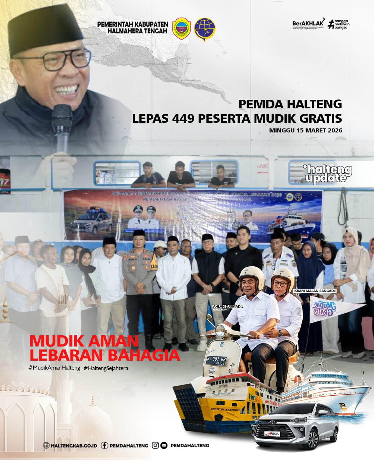 Weda, 15 Maret 2026 – Pemerintah Kabupaten Halmahera Tengah melaksanakan program Mudik Gratis bagi masyarakat dan mahasiswa perantau menjelang Hari Raya Idul Fitri 1447 Hijriah. Pelepasan peserta mudik gratis dilakukan langsung oleh Bupati Halmahera Tengah Ikram Malan Sangadji bersama Wakil Bupati Ahlan Djumadil di Pelabuhan Weda,