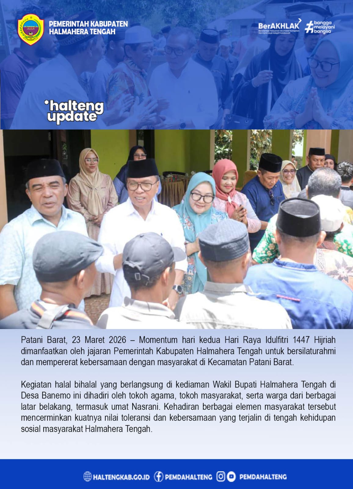 Patani Barat, 23 Maret 2026 – Momentum hari kedua Hari Raya Idulfitri 1447 Hijriah dimanfaatkan oleh jajaran Pemerintah Kabupaten Halmahera Tengah untuk bersilaturahmi dan mempererat kebersamaan dengan masyarakat di Kecamatan Patani Barat.
