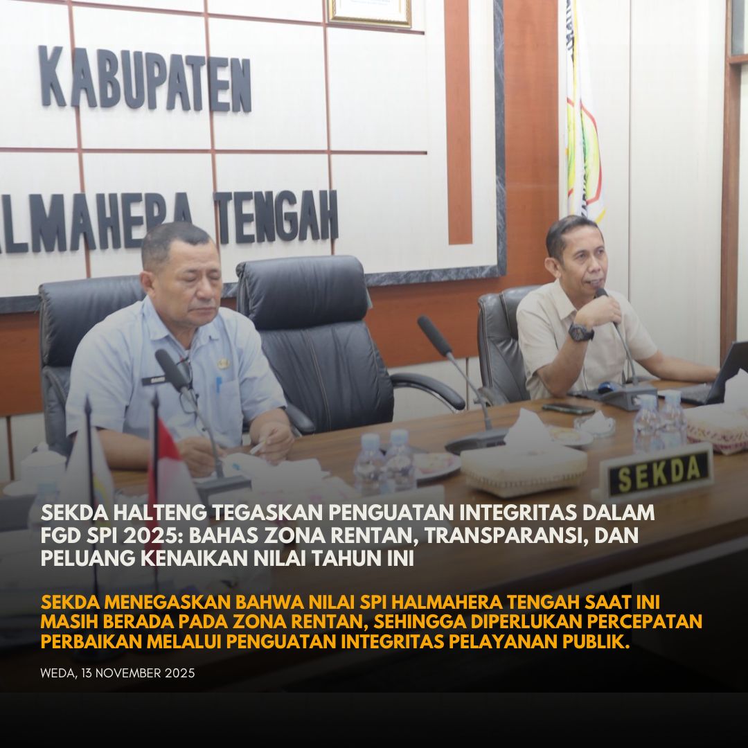 Sekretaris Daerah Kabupaten Halmahera Tengah memimpin Focus Group Discussion (FGD) Survei Penilaian Integritas (SPI) 2025) yang digelar di Ruang Rapat Bupati Halmahera Tengah. Kegiatan ini merupakan bagian dari pendalaman kualitatif SPI yang diselenggarakan oleh KPK bekerja sama dengan Universitas Khairun, serta dihadiri oleh Ketua Tim Mitra Survei, Dr. Irfan Zamzam, SE., M.Sc., Ak., CA., CFA., CFP., CRA., CRP.
