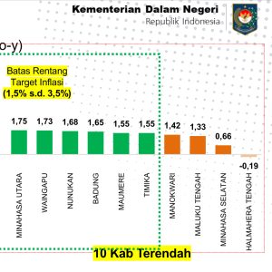 Halmahera Tengah, 24 November 2025 — Kabupaten Halmahera Tengah mencatat prestasi nasional dalam upaya pengendalian stabilitas harga daerah. Berdasarkan rilis Badan Pusat Statistik yang dipaparkan dalam Rapat Koordinasi Pengendalian Inflasi Daerah oleh Kementerian Dalam Negeri, Halmahera Tengah menempati posisi pertama sebagai daerah dengan inflasi terendah secara nasional pada Oktober 2025 dengan capaian –0,19 persen, sekaligus menjadi satu-satunya kabupaten dengan inflasi negatif dari 150 daerah sampel IHK.