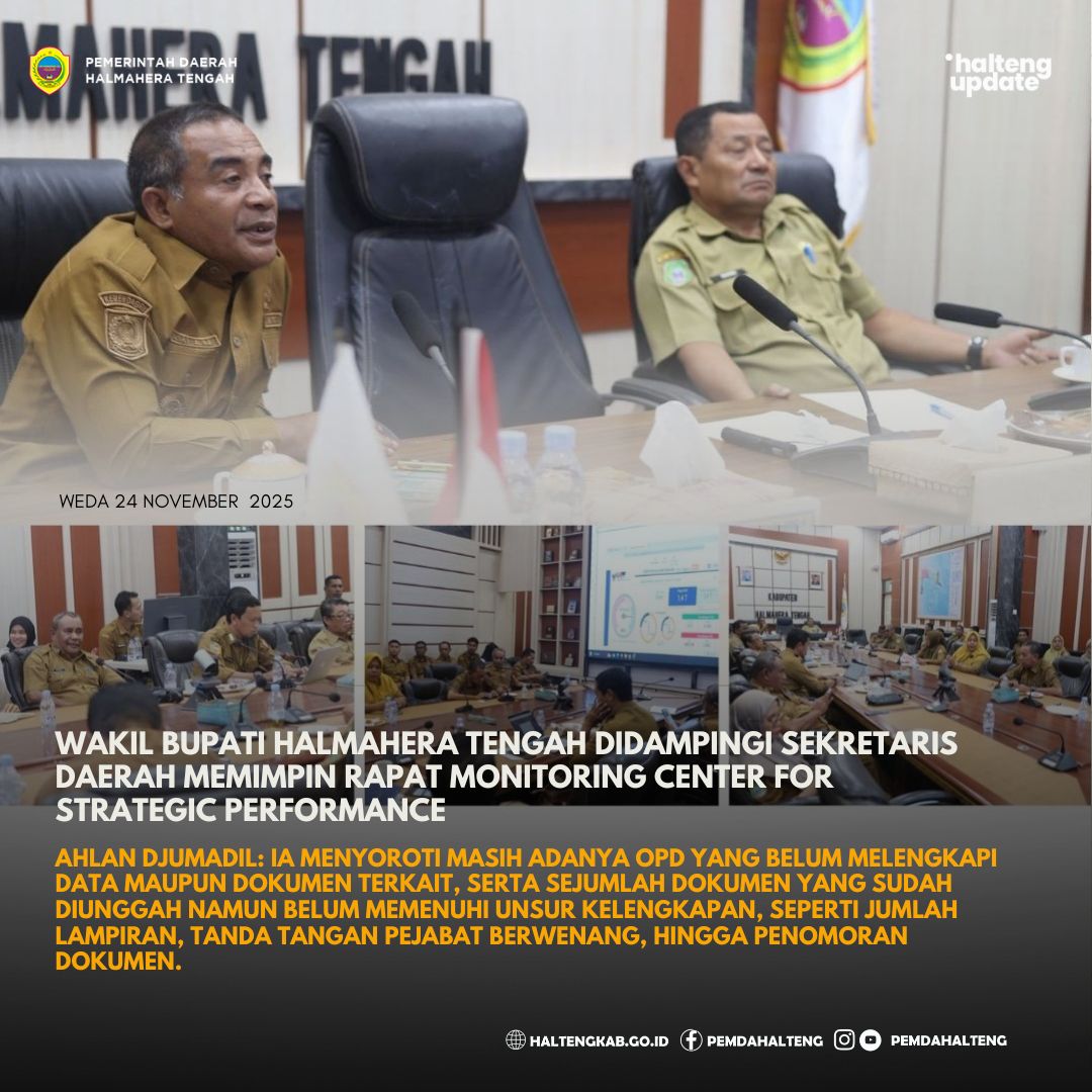Weda, Senin 24 November 2025 — Wakil Bupati Halmahera Tengah didampingi Sekretaris Daerah memimpin rapat Monitoring Center for Strategic Performance (MCSP) yang berlangsung di Ruang Rapat Bupati. Rapat tersebut dihadiri oleh para Pimpinan OPD lingkup 8 Area MCSP serta Admin MCSP.