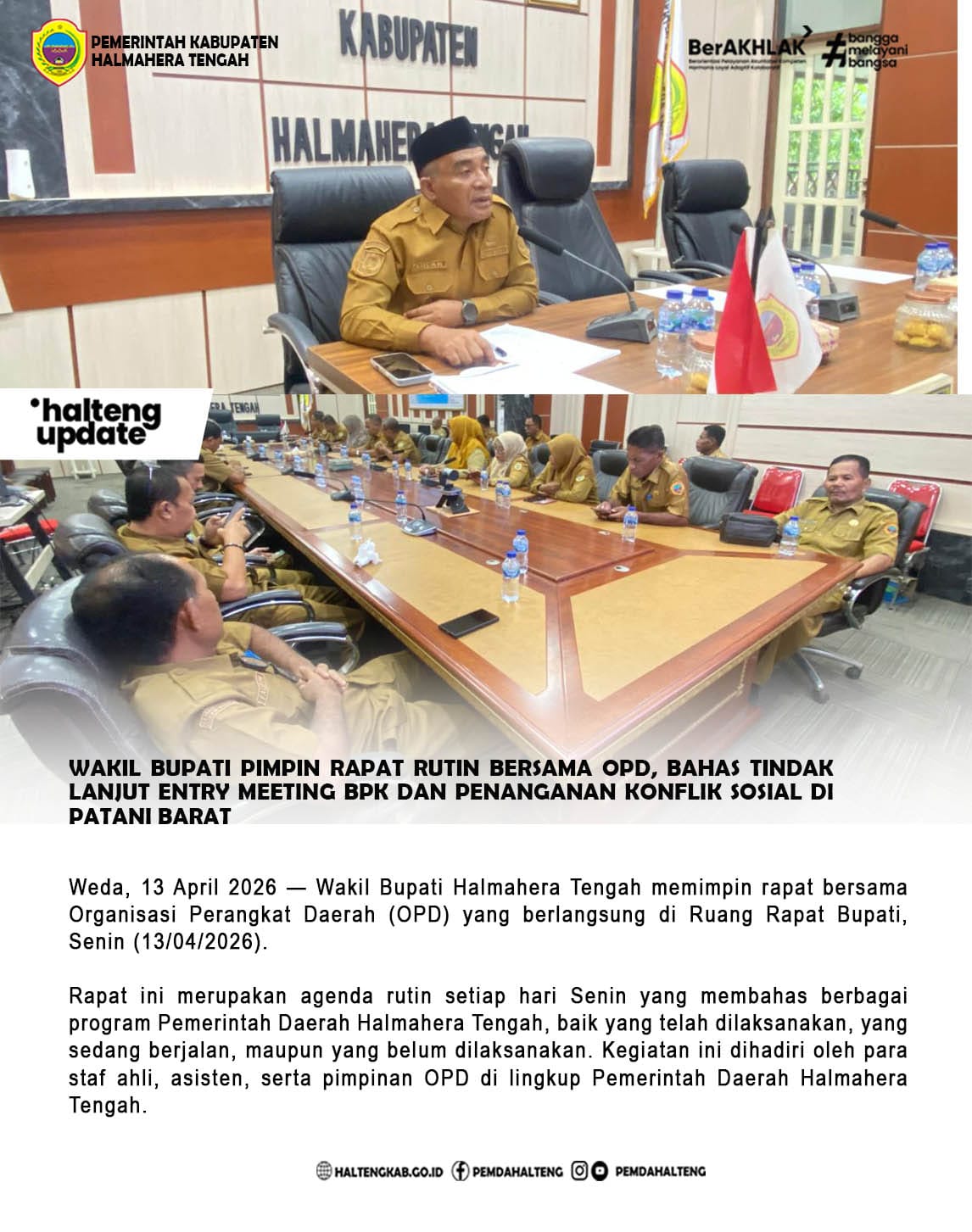 Weda, 13 April 2026 — Wakil Bupati Halmahera Tengah memimpin rapat bersama Organisasi Perangkat Daerah (OPD) yang berlangsung di Ruang Rapat Bupati, Senin (13/04/2026).